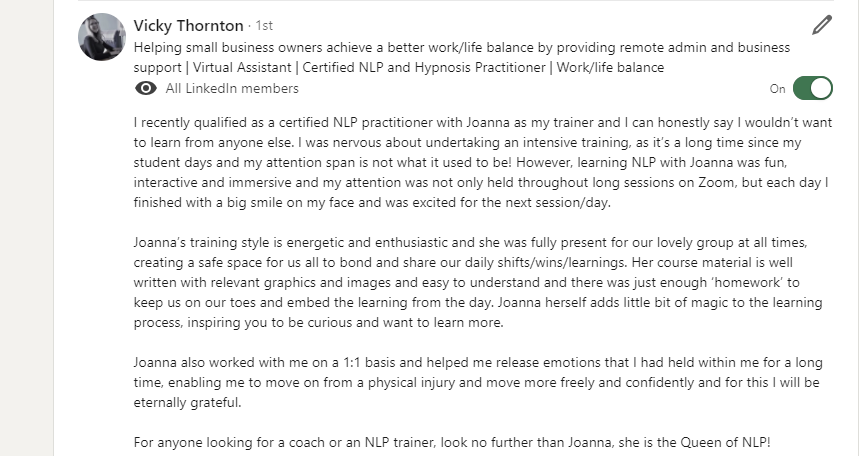 Share a little about you, your goals and why NLP feels important right now.