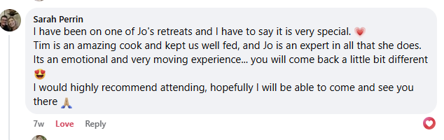 Through powerful and transformative NLP (Neuro Linguistic Programming), Hypnotherapy and Time Line Therapy® workshops with Deep Transformation Expert Jo, additional fun immersive experiences, and home-cooked, locally sourced nourishing meals, you’ll release what no longer serves you, connect with your vision for the future, and step into your next chapter with ease and flow.
